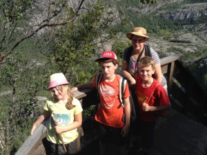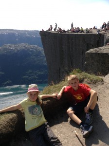 De dag begint uitstekend. We gaan inderdaad vroeg weg en na ruim 4 km staan we bij parkeerplaats aan het begin van de wandeling naar de Preikestolen. Om 9.40 uur vertrekken voor een wandeling die volgens de informatieborden 2 uur heen en 2 uur terug is. Het wandelen gaat goed en de route is prachtig. Heel veel wandelen over schots en scheef liggende stenen, rotsen en boomtakken. De route is maar 3,8 km lang en we stijgen zo'n 350 meter. Er is ook hier sprake van enorme massatoerisme. In lange rijen lopen we naar boven en later weer naar beneden. De uitzichten zijn echter fenomenaal en na 2,5 uur staan we bovenop de Preikestolen, die 604 meter loodrecht omhoog komt uit de Lysefjord. We zien de fjord en de bootjes ver onder ons. De kinderen wagen, liggend op hun buik, een blik over de rand en na een lunch- en fotopauze keren we na 50 minuten weer terug richting de parkeerplaats. Tijdens de afdaling maken we een stop om te gaan pootje baden in het zwemmeer dat je onderweg tegenkomt. De jongens proberen Krista uit om te peilen hoe diep het water is totdat ze voorover valt en tot aan haar hoofd nat is. Ze wordt weer drooggemaakt en trekt Ruud's dikke trui aan om de afdaling verder te vervolgen. Ze is niet de enige, want op de heen weg lopen we over een pad van houten balken, als Paul bij een infobord wil gaan kijken. Hij stapt van het pad af en staat meteen tot zijn enkels in de modderen valt voorover. Schoenen onder de bagger, benen en armen zwart, de rest is redelijk droog enschoon gebleven. Gelukkig zijn er veel stroompjes water waar je weer een beetje mee kan worden opgekalefaterd. De terugreis loopt verder voorspoedig tot Liske last krijgt van haar linkerknie in het opvangen van alle stappen naar beneden. Als we weer wat rechteruit lopen, wordt de pijn weer minder, maar zodra we weer stijl naar omlaag gaan, gaat het weer mis. We hebben het gered, zij het met wat kleine hobbels en we zijn zeer trots op ons zelf, in ruim 5,5 uur zijn we heen en terug gewandeld. Als traktatie genieten we van een heerlijk ijsje.