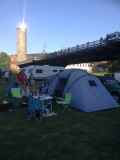 Nadat we ons thuis eerst nog een rotje hebben gewerkt om de boel een beetje netjes achter te laten (gras maaien, stofzuigen, moestuin aan kant, vuiknisbakken legen etc etc.) zijn we op weg. Vlak bij de Duitse grens nog even een tussenstop gemaakt om nog even naar kantoor te bellen. De zon schijnt lekker dus het dak kan eraf. We worden vriendelijk toegezwaaid door de bezoekers op het terras en vertrekken naar Duitsland. De eerzte toeteraar op de snelweg heeft ons ook al laten schrikken. Oh ja dat is waar ook: er hangen geen spullen buitenboord of auto-onderdelen los, maar anderen zijn enthousiast en zwaaien ons toe. We zien veel opgestoken duimen. We maken veel getoeter mee vandaag. Bijna altijd leuk en gezellig. Een enkele keer een boze vrachtwagenchauffeur die kennelijk niet wil begrijpen dat als we een helling op gaan, de snelheid soms terugzakt naar 60 km per uur. Het gaspedaal tot de bodem intrappen betekent dan niet dat de snelheid omhoog gaat, alleen dat we niet verder terugzakken. We hebben 3 x 2 uur gereden en staan ongeveer 450 km van huis in Hannoversch Münden op een eiknadje in de Fulda. Het uitzicht op vakwerkhuizen, kasteeltorens en bijzondere bruggen is prachtig. We hebben eerst een camping vlakbij Kassel op het oog gehad, maar toen Paul de door Liske uitgezochte camping verder bekeek, bleek het een naturistencamping te zijn. Dat is toch niet helemaal de bedoeling en dus rijden we nog een klein stukje verder.
