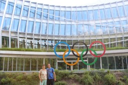 We zijn verder door het centrum geslenterd, zijn naar de kathedraal gelopen waar ook prima uitzicht was over de stad en het meer. Ook hebben we het Olympisch museum bezocht waar de kluisjes in de garderobe al voorzien waren van namen van Olympische sporters. We hebben de kluis, genaamd Yvonne van Gennip, gebruikt. Er was veel te zien over Olympische steden, de attributen en kleding door de jaren heen, de Olympische medailles van alle Spelen, de fakkels en bijzondere verhalen van Olympische sporterts. Ook was er op diverse manieren aandacht voor de Spelen in Parijs volgend jaar. Krista en Liske hebben al erg veel zin om daar naar toe te gaan. We hebben geprobeerd om vanaf het museum langs het meer van Genève terug te lopen naar de camping, maar het was te warm en te laat op de avond, dus hebben we halverwege toch weer de bus terug genomen. Na het uitstappen bij de camping ook nog even naar de ingang van het hoofdkwartier van het IOC gelopen.